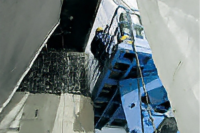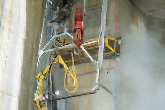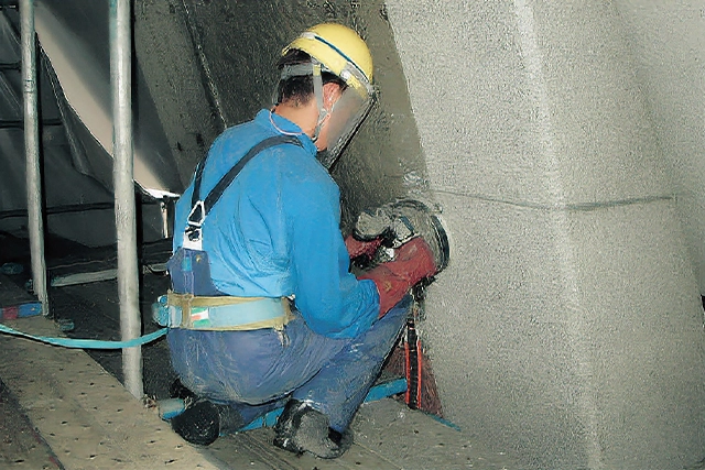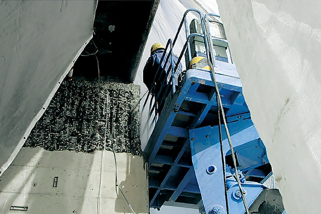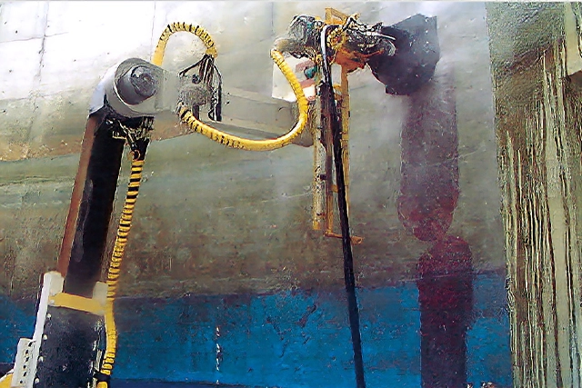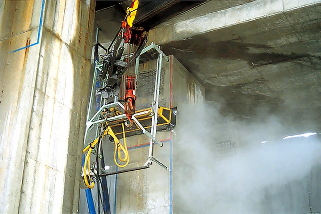 水平、垂直または様々な傾斜角度を持ち、しかも通常では近づきにくい橋脚、ダム壁面等のコンクリート補修箇所を施工するのに最適です。